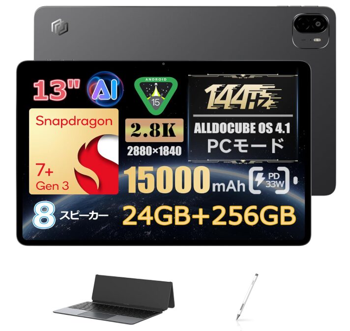 ALLDOCUBE Ultra Pad 13は、13インチの大画面にSnapdragon 7+ Gen3・24GBメモリ・144Hz表示といったハイエンド仕様を詰め込んだ、Android 15搭載の大型タブレットです。最大の特徴は、タブレット本体だけでなく専用キーボード・4096段階スタイラスペンが標準セットになっている点で、購入後すぐに「作業端末」として使える完成度を備えています。