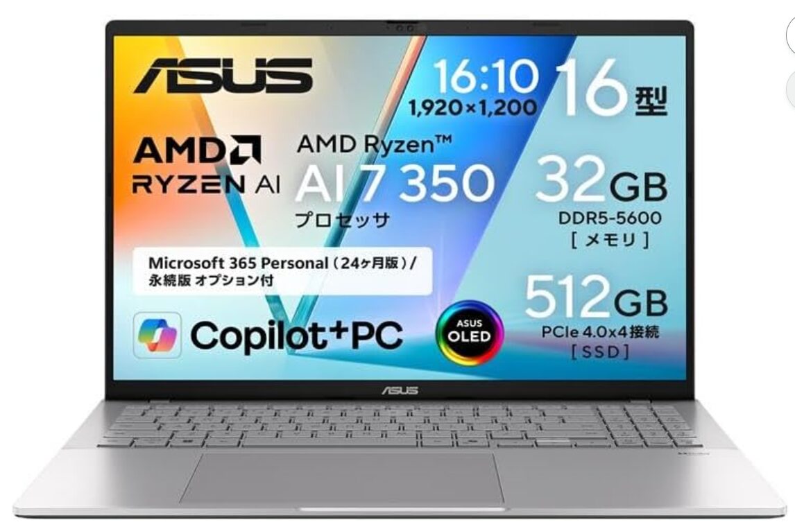 ASUSのVivobook S 16 M3607KAは、Ryzen AI 7 350とNPUを搭載したCopilot+PC世代の16インチノートです。本モデルはAmazon.co.jp限定仕様として、32GBメモリとMicrosoft 365 Personal(24か月版)を標準搭載。有機ELディスプレイによる高品質な表示と、AI処理を見据えた将来性の高さが大きな特徴です。一方で、サイズ感や用途によっては向き不向きも存在します。本記事では、性能・使い勝手・注意点を整理し、このVivobook S 16がどんな人に「買い」なのかを分かりやすく解説します。