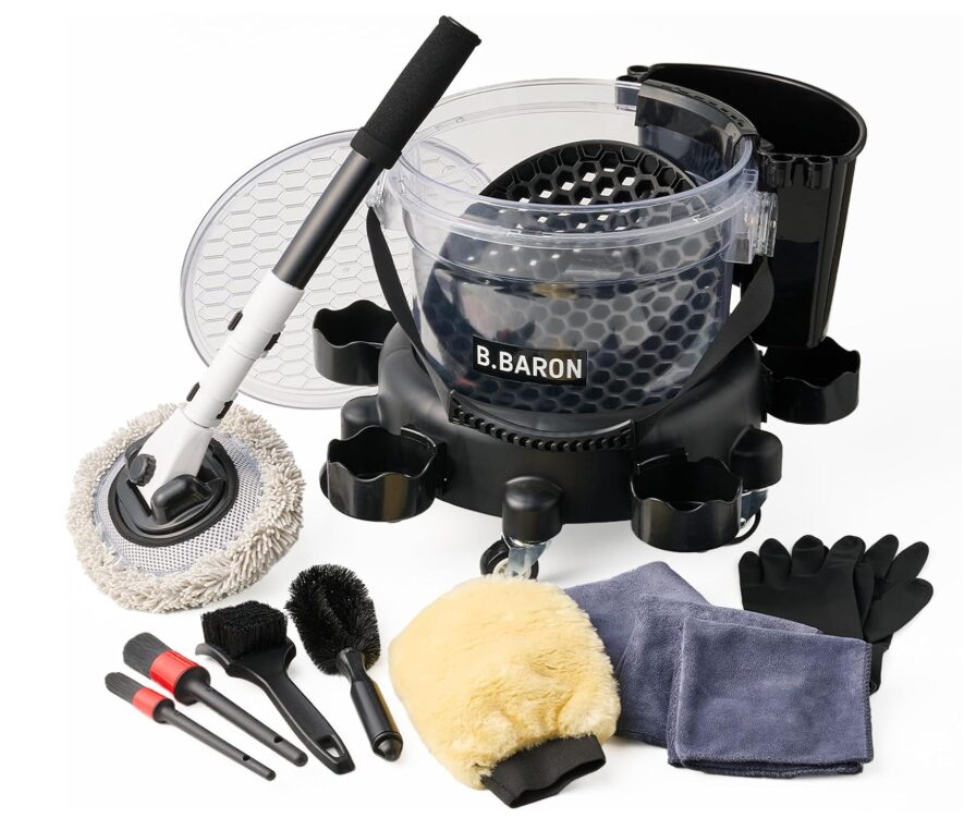 B.BARON洗車セットの強みは、洗車に必要な道具がすべて最初から揃っている点にあります。キャスター付きドーリー付きバケツを中心に、グリッドガード、サイドポケット、タイヤブラシ、ホイールブラシ、2種類のモップ、マイクロファイバータオルが付属。