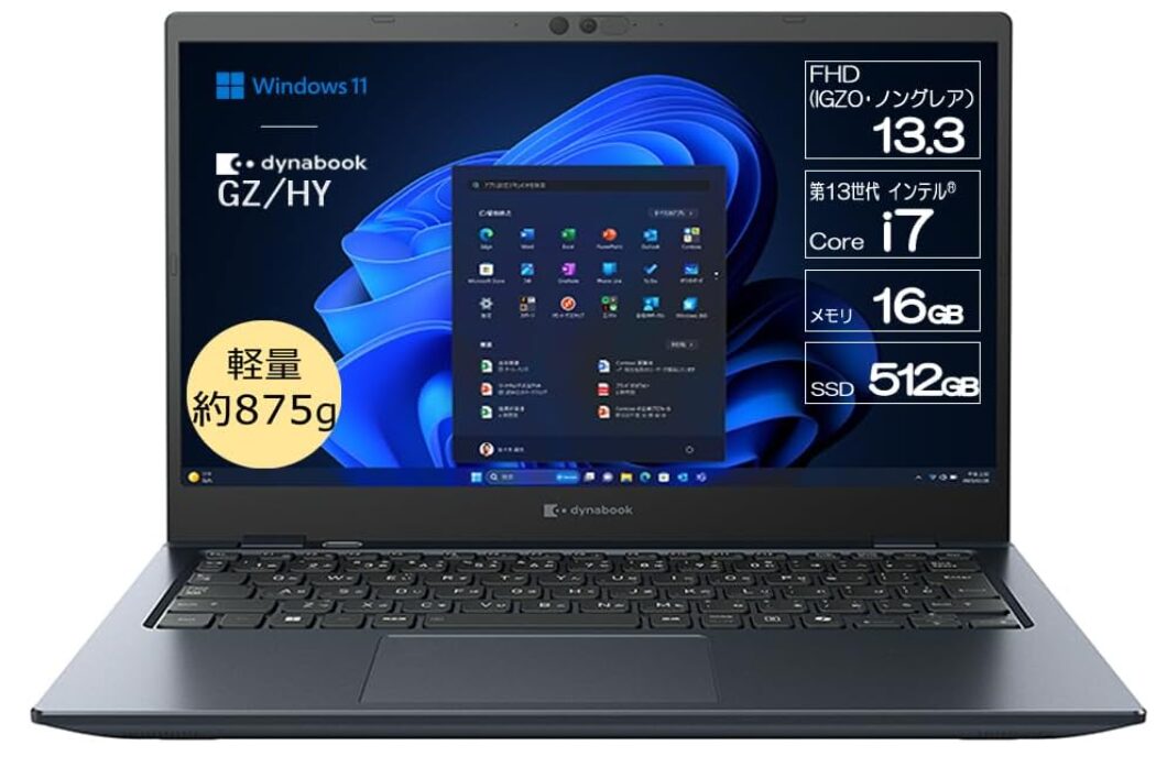 dynabook GZ/HYは、dynabookが展開する超軽量ハイエンド・ビジネスモバイルです。約875gという軽さと13.3型ディスプレイを両立しつつ、第13世代Core i7とCopilotキーを搭載した点が最大の特徴。