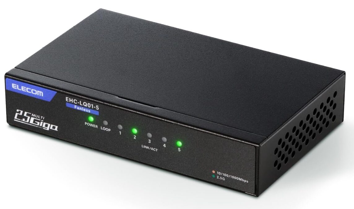 エレコム EHC-LQ01-5は、家庭用・SOHO向け2.5Gbps環境の入口として非常にバランスの良いスイッチングハブです。全ポート2.5Gbps対応、静音ファンレス、金属筐体、ループ検知機能と、日常利用で重視されるポイントをしっかり押さえています。