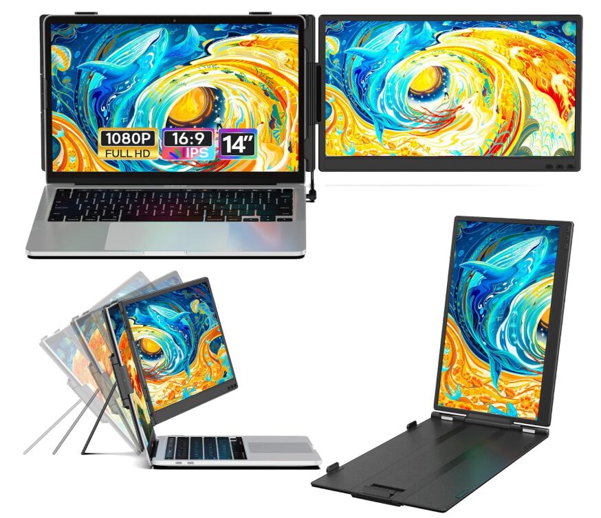 LivElectの14インチ・2画面デュアルモニターは、ノートパソコンに装着して作業領域を一気に拡張できるスクリーンエクステンダーです。左右(または片側)に画面を追加する構成により、従来の1画面作業と比べて視線移動を最小限に抑えつつ、複数アプリを同時表示できます。