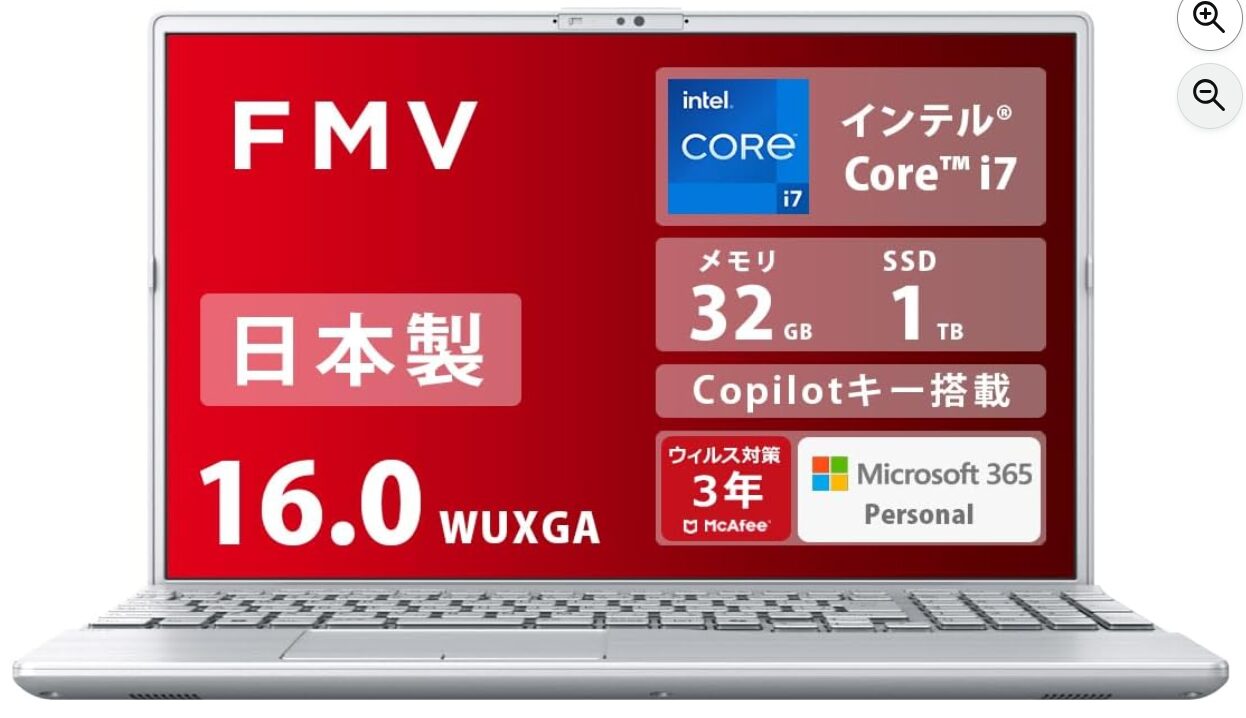 FMV Note A WA3-K3は、「派手な性能よりも、安心して長く使えるノートパソコンが欲しい人」に向いたモデルです。Core i7-1355Uとメモリ32GB、SSD 1TBという構成は、仕事や家庭用途では十分すぎるほど余裕があり、数年先まで快適に使える安心感があります。