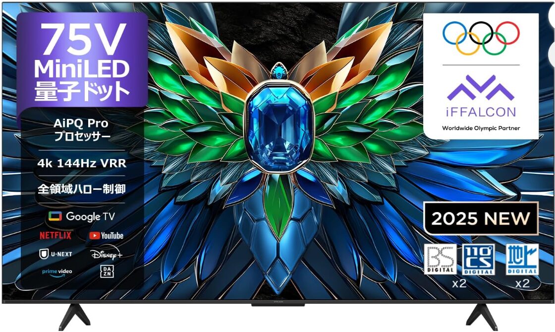75V型の大画面テレビで、画質・ゲーム性能・スマート機能をすべて重視したいなら、iFFALCON 75U85は注目すべきモデルです。Mini LEDと全域ハローコントロールによる高コントラスト表現に加え、1000nitの高輝度で昼間の視聴でも映像がくっきり。144Hzネイティブ表示とHDMI2.1、VRR対応により、PS5やゲーミングPCでも快適にプレイできます。Google TV搭載で配信サービスや音声検索にも対応し、録画機能も完備。本記事では75U85の実力を用途別に詳しく解説します。