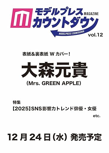モデルプレスカウントダウンマガジン vol.12は、「影響力」を軸に2025年のエンタメシーンを総括する一冊です。表紙・巻頭特集では大森元貴(Mrs. GREEN APPLE)を大ボリュームで特集し、ミュージシャン、作家、俳優という三つの顔を独占グラビアとインタビューで深掘り。さらに関係者取材によって、その影響力の源泉にも迫ります。