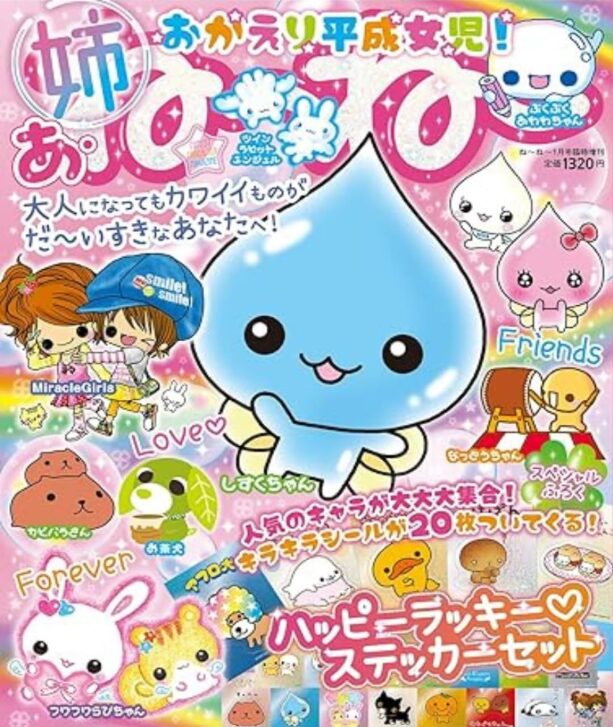 『あ・ね~ね~ おかえり平成女児!』1月号臨時増刊は、平成時代に子どもだった世代へ贈る“ときめき復活”の特別号です。しずくちゃん、お茶犬、コジコジ、カピバラさんなど懐かしのキャラクターが大集合し、さらに豪華付録としてキラキラステッカーセットやポストカードも付属。遊べるコンテンツ、特集記事、平成カルチャーを深堀りする企画が満載で、大人になった今でも“かわいい”を楽しみたい人にぴったりの内容です。親子でも楽しめるため、世代を超えて楽しめる保存版の一冊と言えるでしょう。
