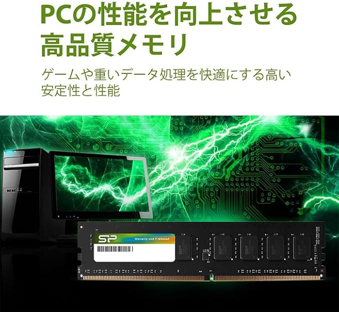 本メモリは1.2Vの低電圧設計を採用しており、これはDDR4規格ならではの大きな利点です。旧世代のDDR3(1.5V)と比べると、消費電力が抑えられ、システム全体の発熱量も低減されます。