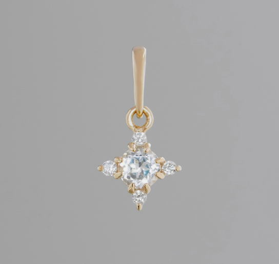 チャームのデザインは、中央のフェナカイトを囲むように、上下左右に配置された4石のダイヤモンドが十字を描く神秘的なスタイル。この十字型の配置は、古来より“方向性・指針・守護”を象徴し、高次元との繋がりを促すとされています。静かに胸元で輝く十字の光が、所有者の心を整え、迷いを払って進むべき道に導いてくれるようなデザイン性を持ち合わせています。