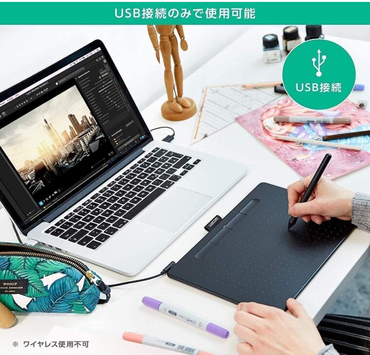 イラスト制作・漫画原稿・簡単なデザイン・写真レタッチなどであれば十分対応可能です。ただし、傾き検知や多機能なショートカットを多用するプロ用途では、Intuos Proの方が向いています。